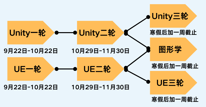 - 第三轮时 Unity、UE 方向可选择切换 图形学 方向,完成 图形学 的招新题目,而非 程序 的 Demo开发