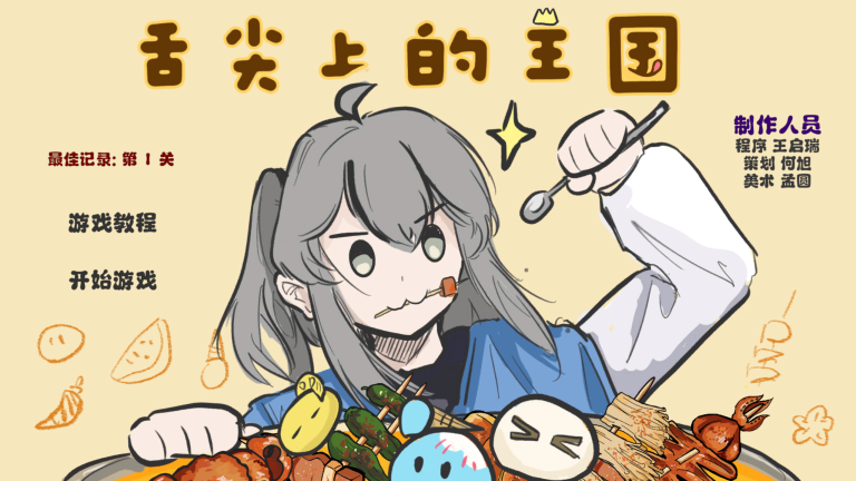 《舌尖上的王国》是一款俯视角战斗类游戏。玩家在游戏中误入美食王国,进而展开一场“吃吃吃”的冒险。在游戏中,你既可以选择食用各种美食,利用它们的特殊效果击败敌人,也可以将敌人作为自己的一餐——直接啃食敌人!同时,我们引入了饱腹值的概念,在游玩途中,玩家需要控制饱腹值在一定范围内,以防止受到负面效果。我们还引入了“燃烧”、“冰冻”、“满足”等多种特殊效果的食物与敌人,欢迎大家前来游玩与探索~